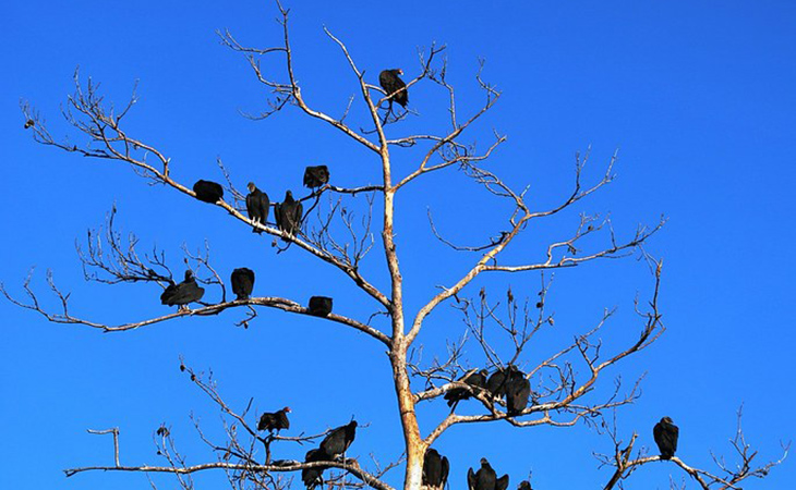 Volar en círculos es una rutina diaria sin embargo, si los gallinazos vuelan persistentemente sobre una área determinada y comienzan a aterrizar y posarse en los árboles, esto significa casi siempre que han detectado una carcasa y se alistan a acercarse y consumirla.