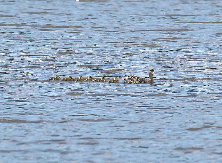 Hembra de Pato Media Luna con 6 polluelos nacidos en la Laguna El Oconal (Pasco). Foto: Tomada por Roger Ahlman el 1 de Diciembre, 2001.