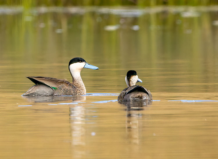 Plumaje del Macho: El macho del Pato de la Puna tiene la mitad superior de la cabeza negra, mejillas y cuello de color blanco, pecho y vientre con pequeñas manchas negras que se convierten en barras en los flancos.