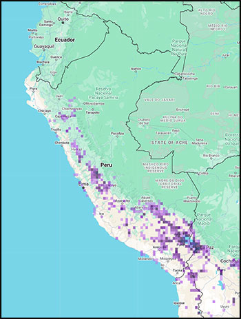 Distribución Global: La especie se distribuye en los Andes de Perú, oeste de Bolivia, norte de Chile y noroeste de Argentina. No se encuentra fuera de Sudamérica.