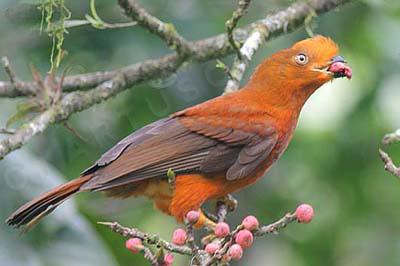 - Desde una percha cercana, vuela y arranca rápidamente los frutos colgantes para luego percharse en otra para tragarlos cómodamente. Repite esta acción varias veces y luego vuela y desaparece en la espesura del bosque, quizá para descansar o de regreso al lek en los machos o a alimentar a los polluelos en la hembra.