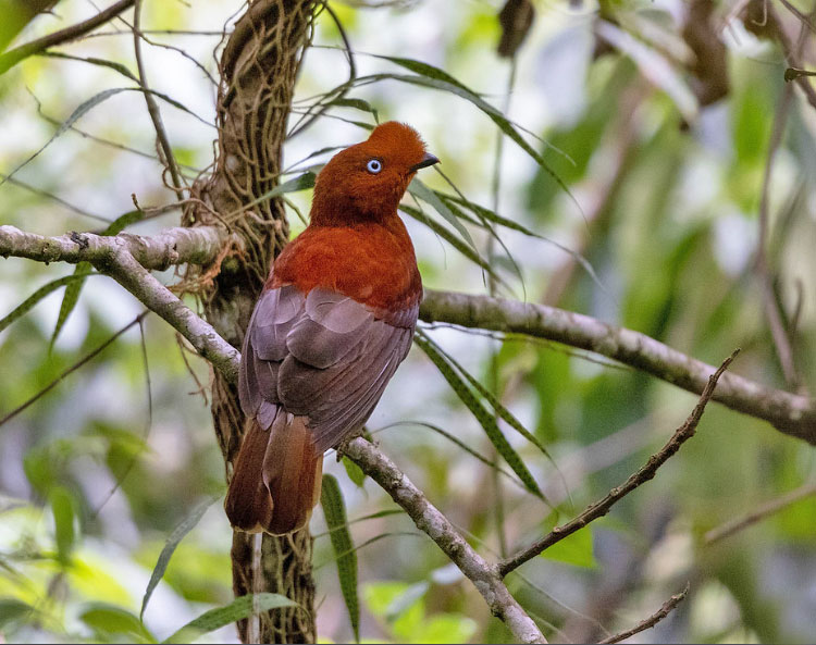 Plumaje de la Hembra: Existe un dimorfismo sexual marcado. La hembra tiene un plumaje de color marrón anaranjado en todo el cuerpo y una cresta más pequeña. El plumaje es de color marrón castaño oscuro.