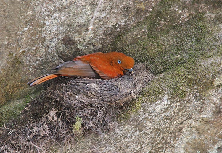 Descripción del nido: El nido del Gallito de las Rocas Andino tiene forma de taza cóncava y está hecho principalmente de barro y material vegetal como pedazos de raíces, ramitas, y musgo.