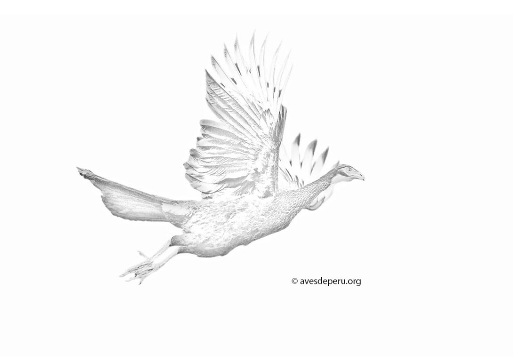 - Descripción: Este dibujo representa a una pava en vuelo. Las alas están extendidas mostrando el contraste entre el blanco y marrón oscuro de las alas y resto del cuerpo.