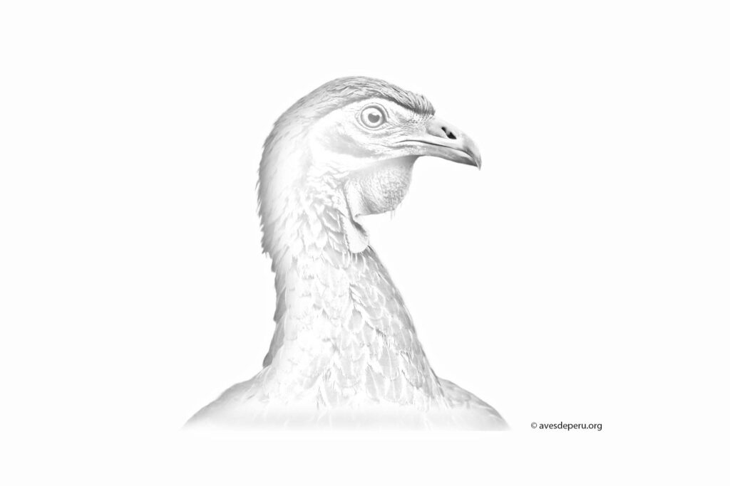- Descripción: El dibujo representa un retrato de la especie mostrando patrones de plumaje en el pecho y cuello. También muestra detalles de la cabeza.