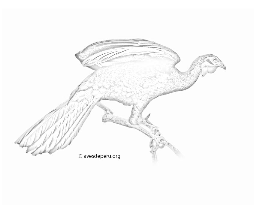 - Descripción: Dibujo de una Pava Aliblanca perchada en una rama delgada. Las alas semiabiertas son para mantener el balance.